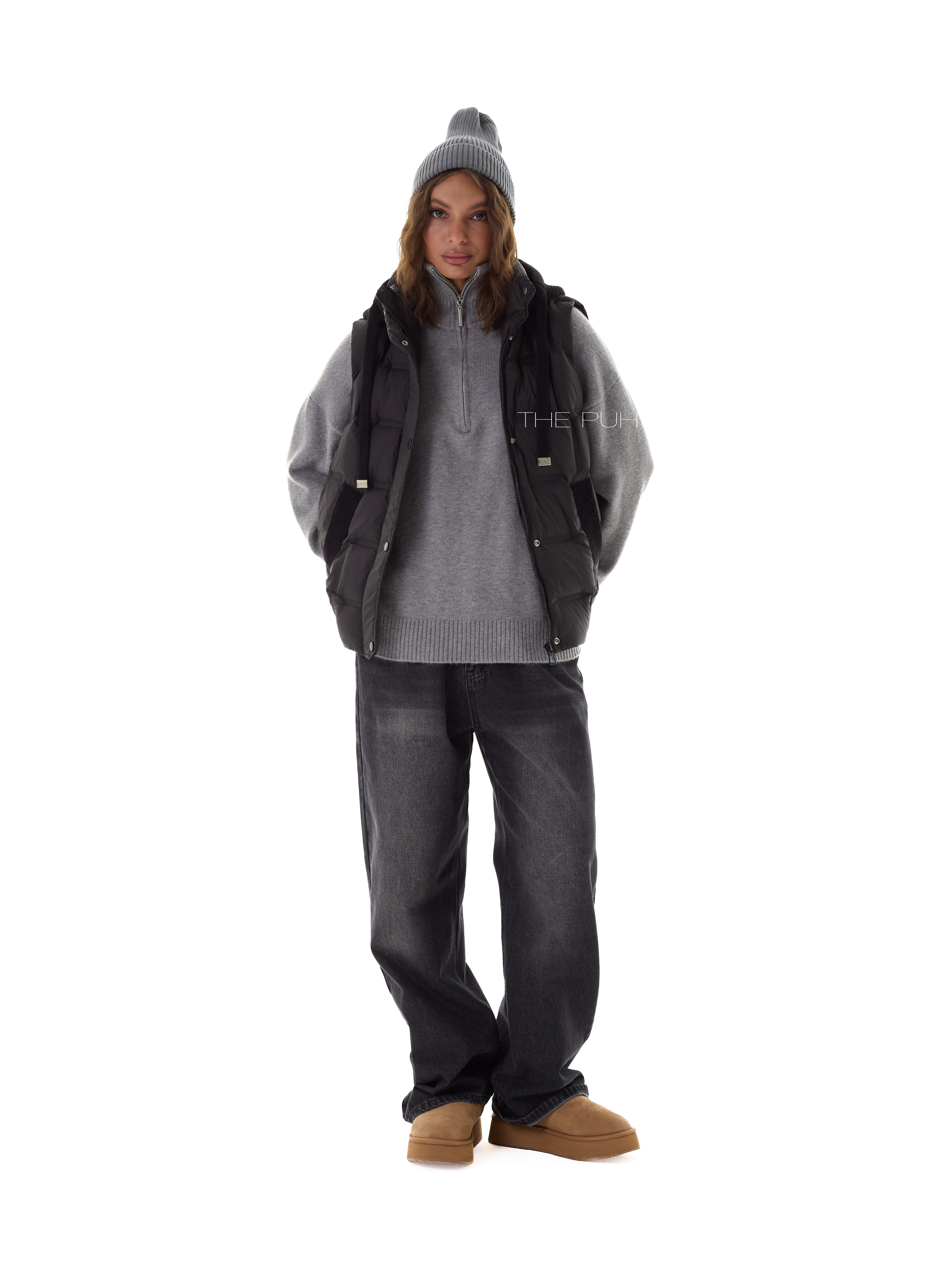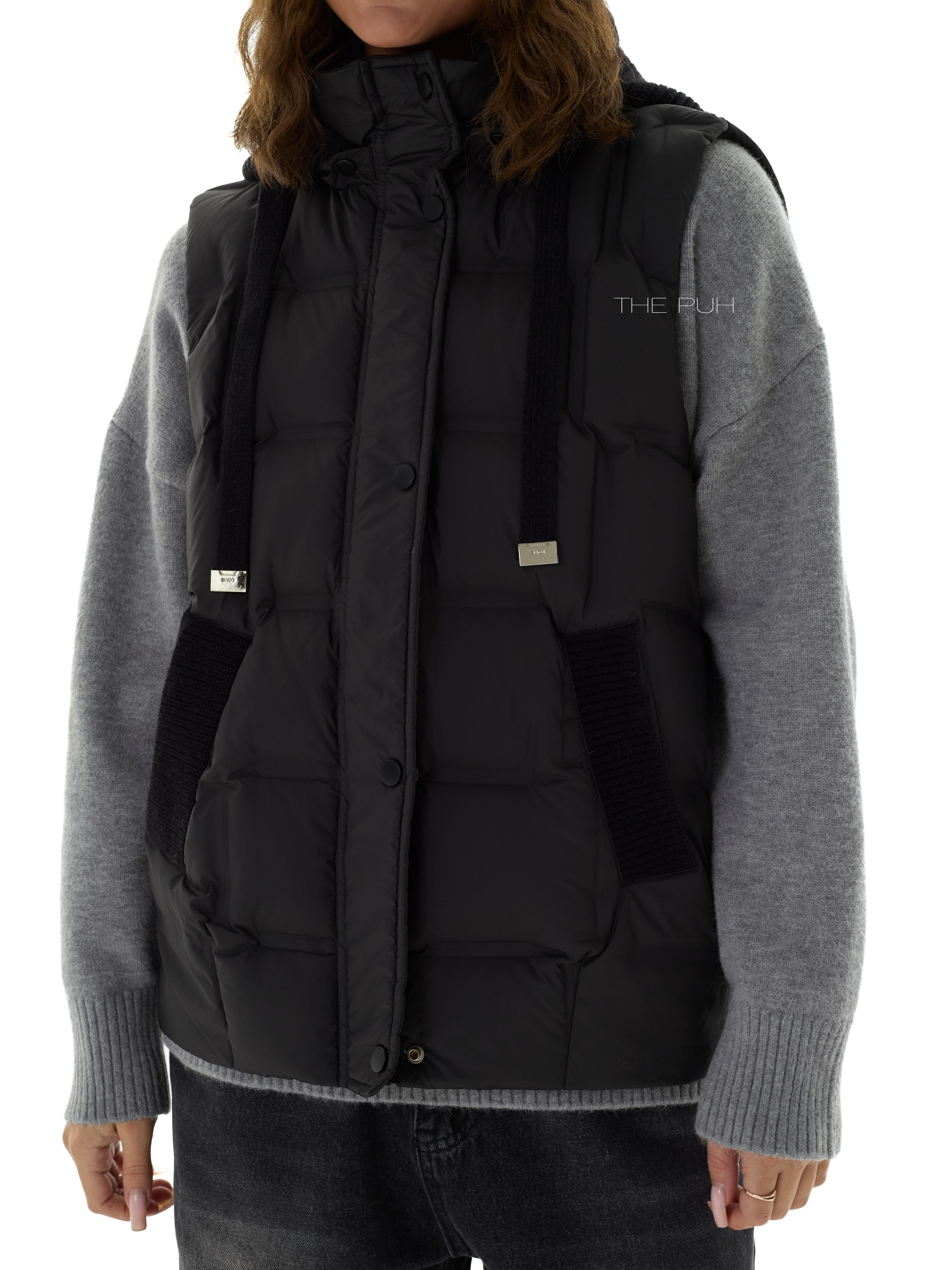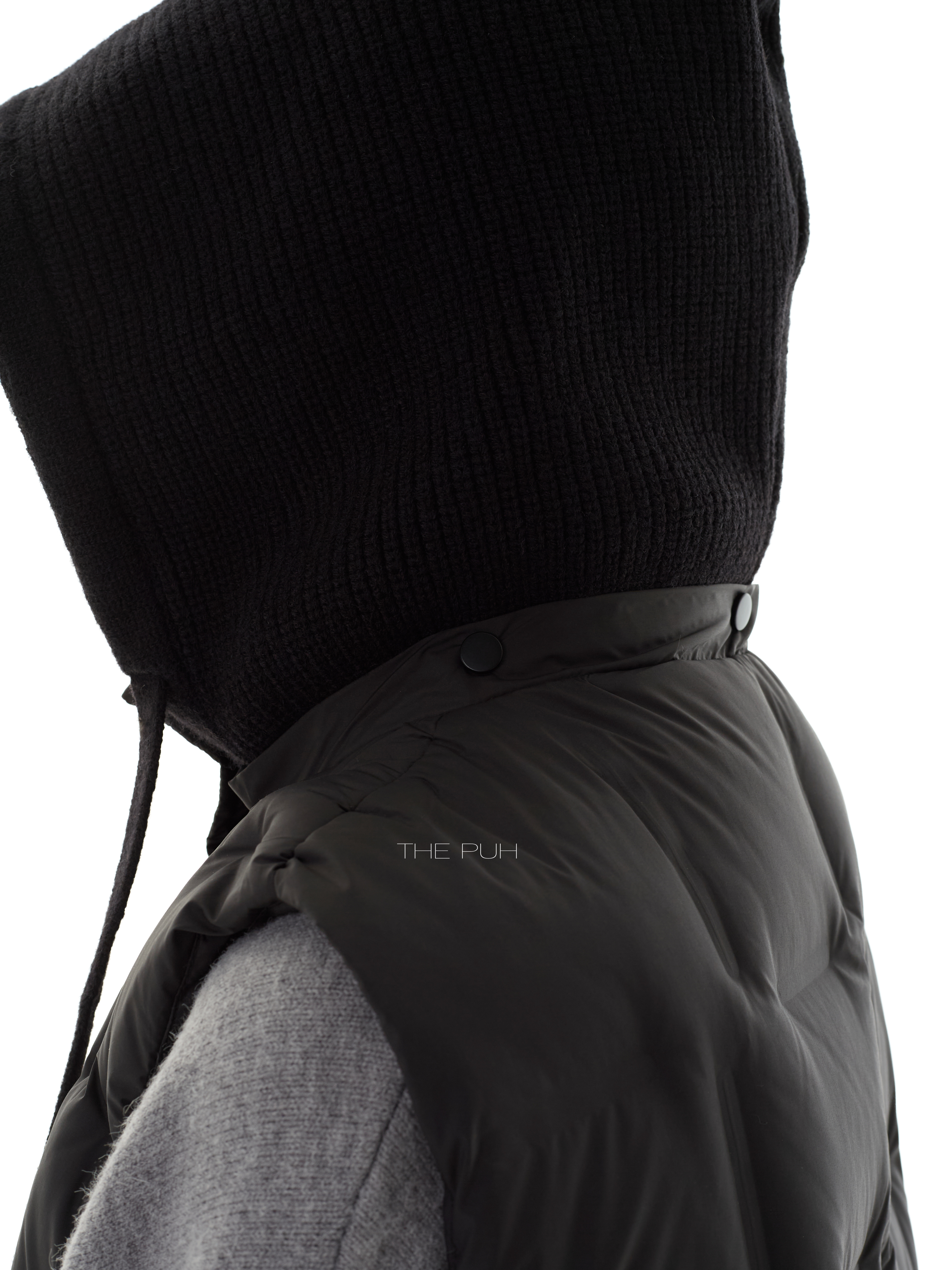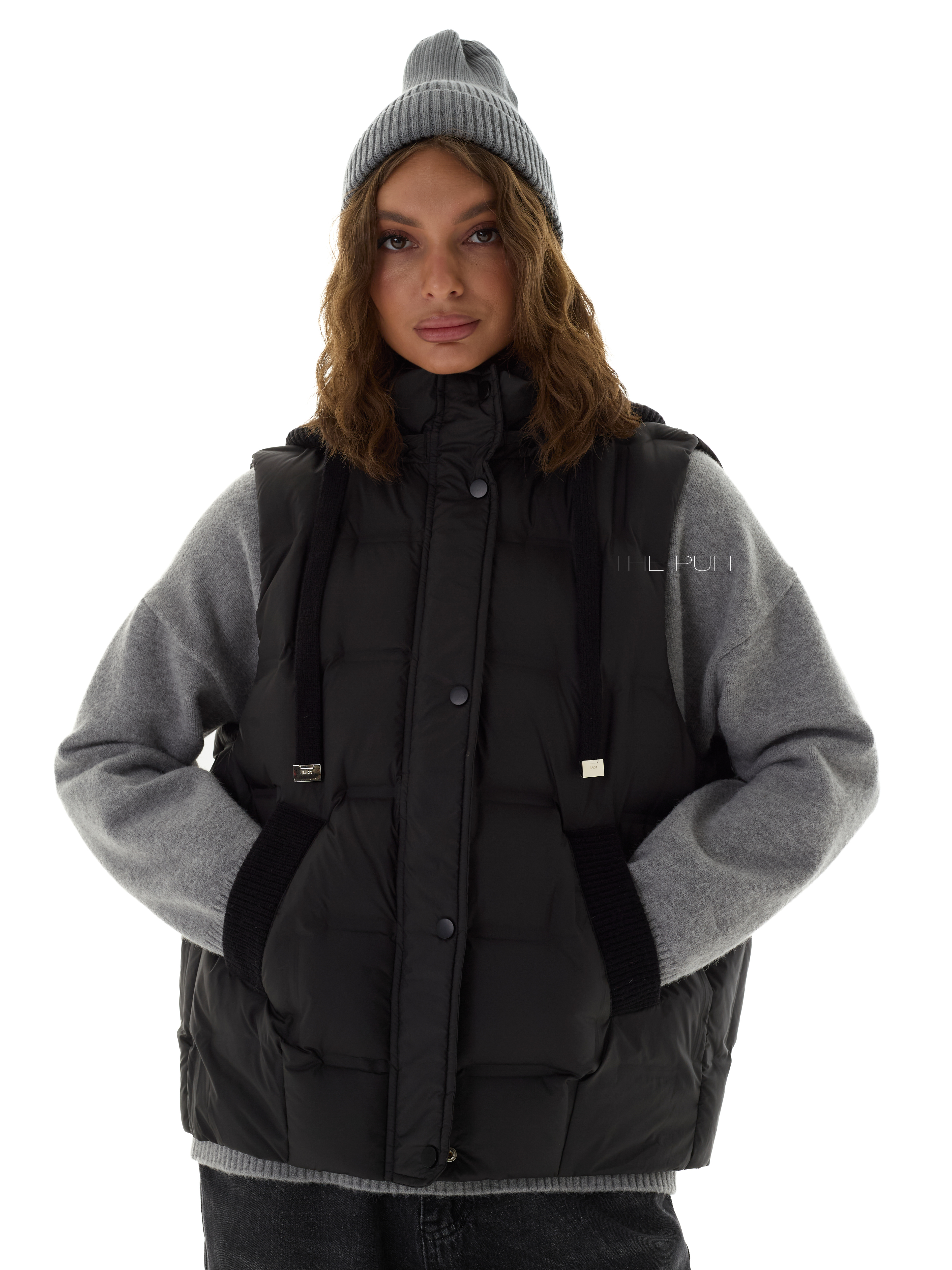 Тонкий жилет-пуховик в черном цвете со съемным вязаным капюшоном. Модель утеплена натуральным гусиным пухом и идеально подойдет на позднюю осень и первые заморозки, а также послужить отличным нижним слоем под пальто.